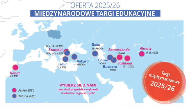 Promowanie oferty polskiego szkolnictwa wyższego i uczelni uczestniczących w programie na wspólnym stoisku Study in Poland podczas międzynarodowych targów edukacyjnych za granicą. Zgodnie z ustaleniami Komitetu Koordynacyjnego Study in Poland, w roku 2025/26 będą to następujące targi edukacyjne: