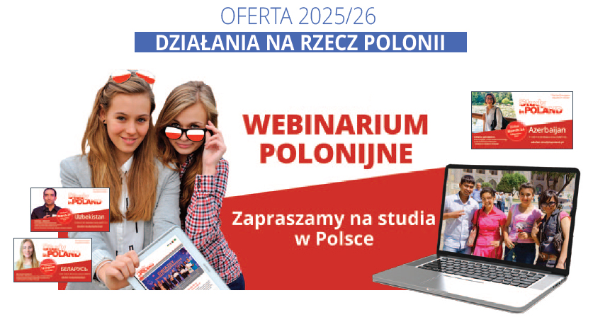 W roku akad. 2025/26 program Study in Poland włączy się pilotażowo w działania mające na celu zwiększenie liczby studentów polonijnych w polskich uczelniach. Planujemy cykl trzech webinariów polonijnych, adresowanych do młodzieży w różnych regionach świata, które zostaną przeprowadzone wspólnie z Departamentem Współpracy z Polonią i Polakami za Granicą MSZ oraz polskimi placówkami dyplomatycznymi i konsularnymi.
